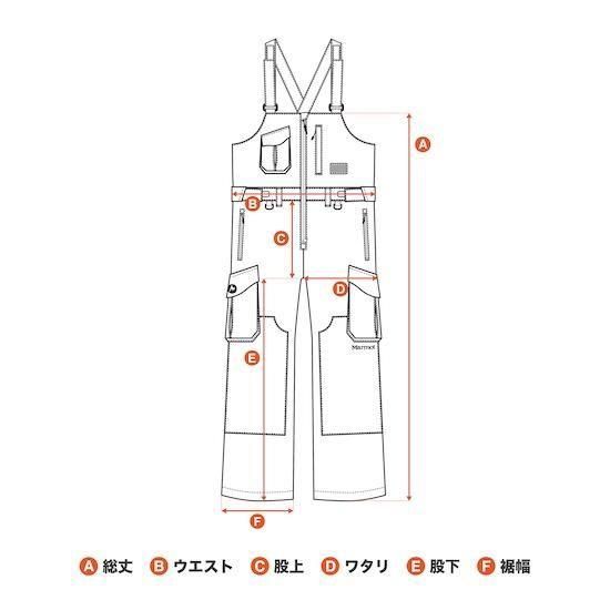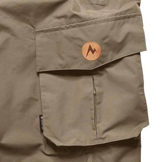 裾に足付き旧ロゴ仕様の GORE-TEXロゴMarmot のロゴ、右サイドポケットに Marmot のドットロゴ、バックには右側脹脛部分にSTABRIDGEのロゴAPT FIELD TESTING のロゴが入ります